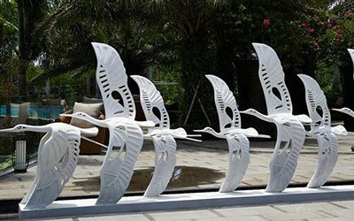 剪影雕塑,看的就是個(gè)輪廓!把你想做的東西(人、動(dòng)物、樹啊啥的),簡化成影子形狀。材料選擇多:不銹鋼、耐候鋼(喜歡生銹那種質(zhì)感)、玻璃鋼、鍍鋅板、鐵板都成。最后還得靠噴漆,給它們打扮上顏色。